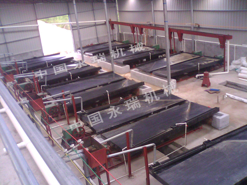 公司经过当年苦心研究,采用6-S型摇床、的床面进行组合,成功改进了新型6-S摇床重选设备。实践证明,传统摇床因其每种型号床面的来复条从粗选区至精选区制造成一个水平面,粗砂、细砂、矿泥需分别使用不同型号来复条的床面。所以在选矿过程中,矿粒群在床面上进行松散分布,不能根据各自的运动轨迹适时地进行送矿和尾砂排放,对于处理粒度不同的矿砂,精矿回收率较低。